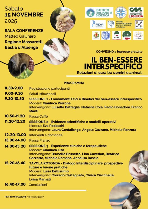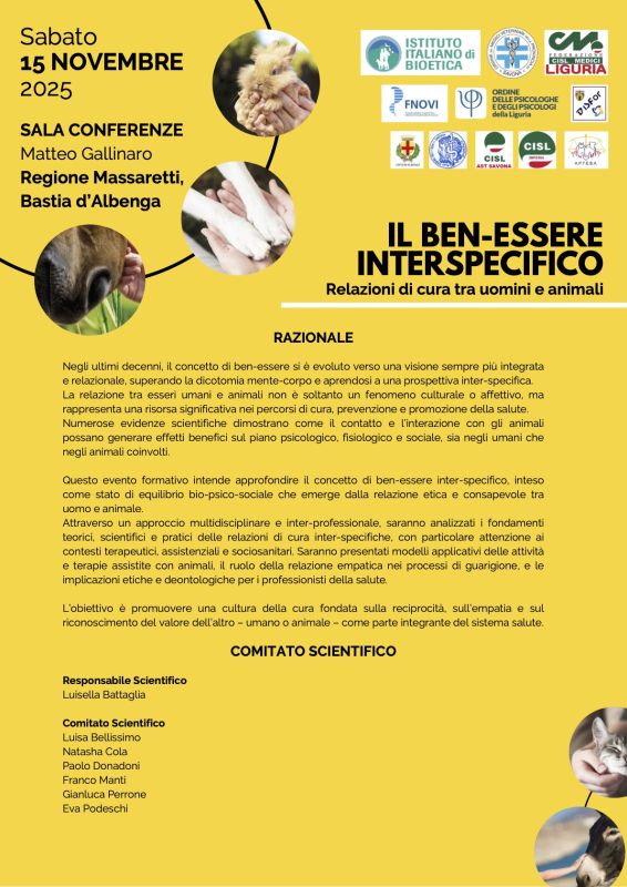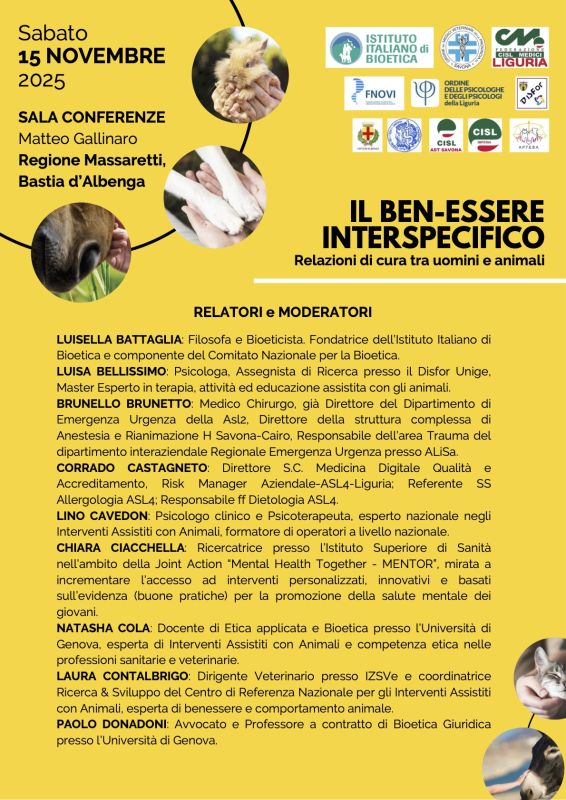 Sabato 15 novembre ad Albenga, nella Sala Conferenze Matteo Gallinaro in Regione Massaretti, a Bastia d'Albenga, il Convegno Il ben-essere interspecifico. Relazioni di cura tra uomini e animali.