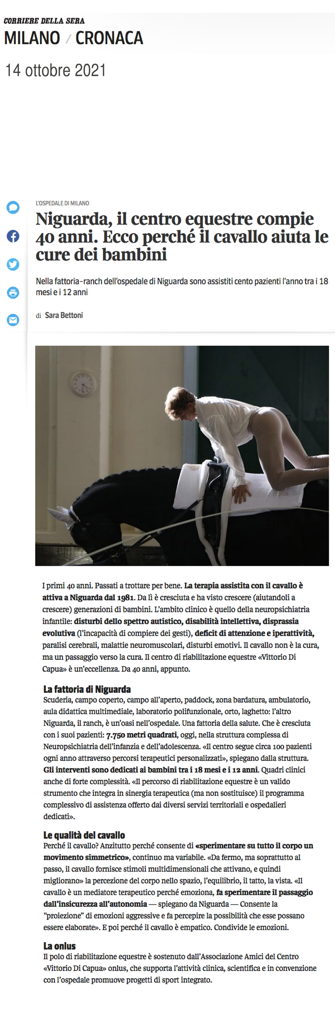 Unica realtà nazionale all’interno di una struttura ospedaliera, il Centro di Riabilitazione Equestre “Vittorio di Capua” di Niguarda ha festeggiato i 40 anni di storia, di assistenza e di cure attraverso la terapia assistita con il cavallo.