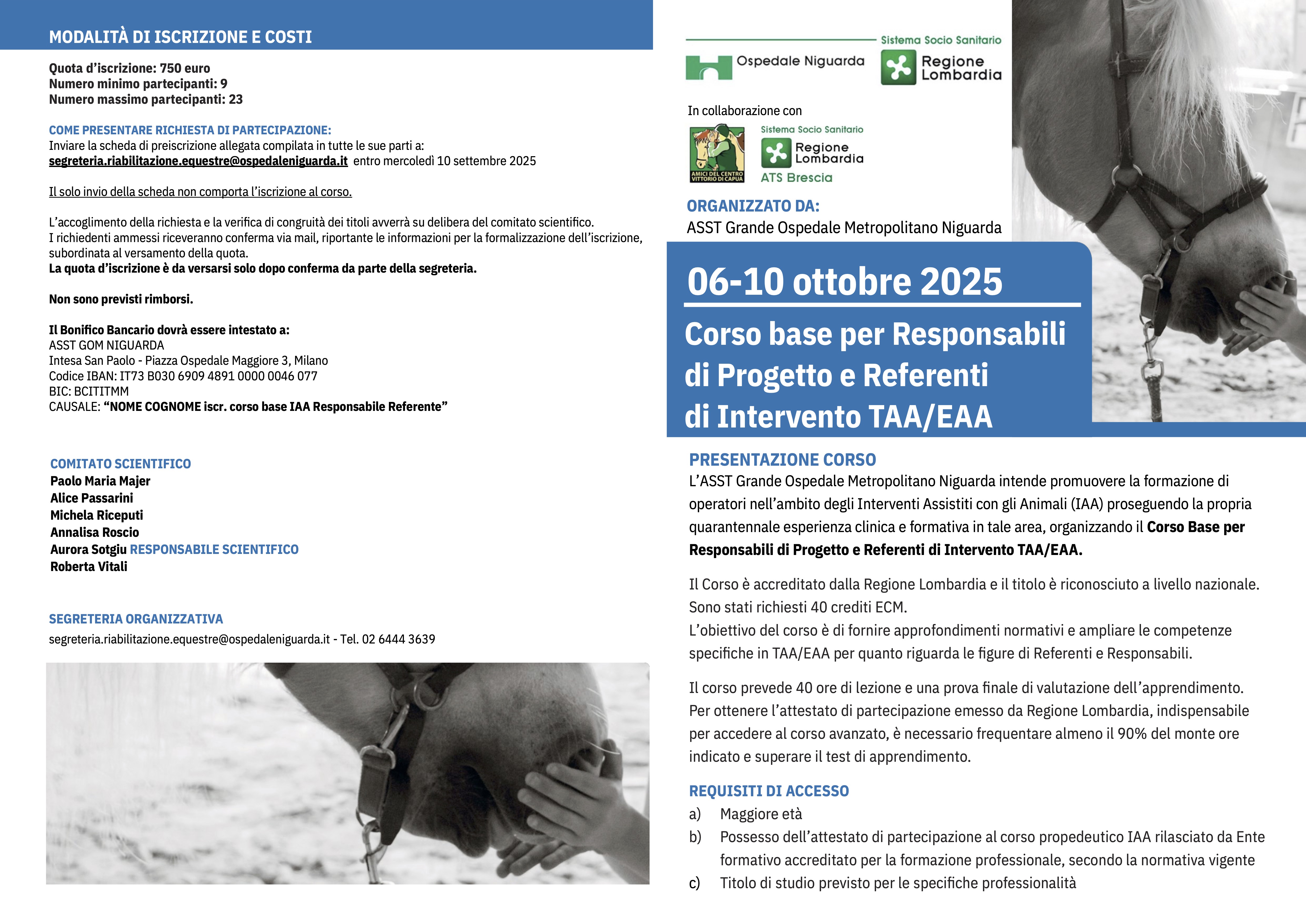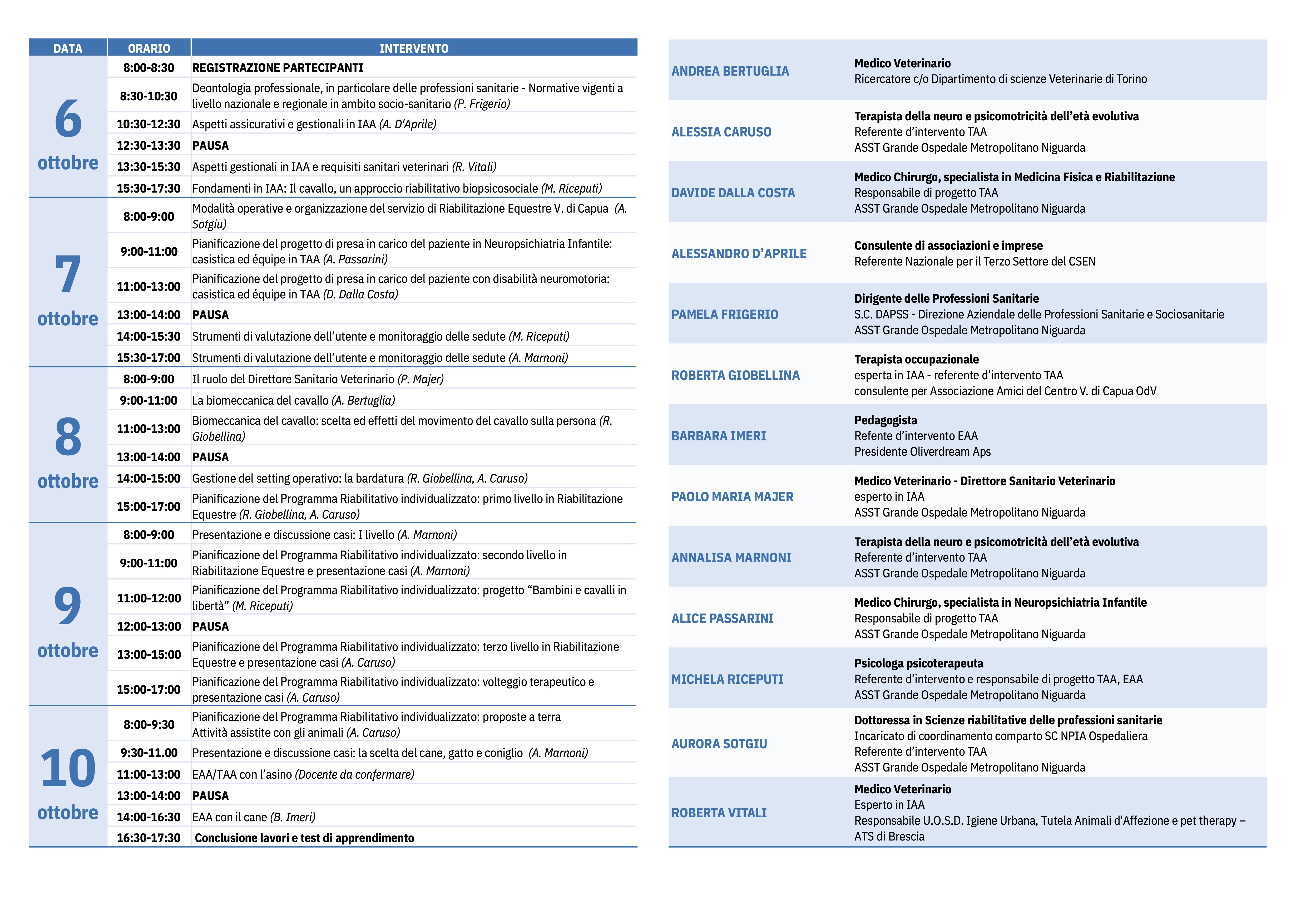 Il corso completa l’iter formativo per le figure professionali e operatori dell’équipe degli IAA e fornisce le conoscenze tecniche, educative e cliniche per poter svolgere il lavoro di équipe negli IAA.