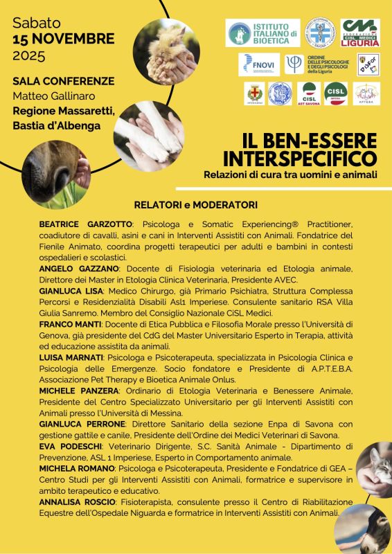 Sabato 15 novembre ad Albenga, nella Sala Conferenze Matteo Gallinaro in Regione Massaretti, a Bastia d'Albenga, il Convegno Il ben-essere interspecifico. Relazioni di cura tra uomini e animali.